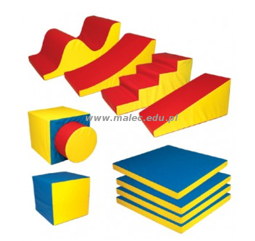 łuk 100 x 50 x 50 cmfala 100 x 50 x 50 cmklin – 100 x 50 x 50 cmschody – 100 x 50 x 50 cm4 x materac – 100 x 100 x 7 cmtunel – 50 x 50 cmwalec – 50 x 38 cmkostka – 50 x 50 cm